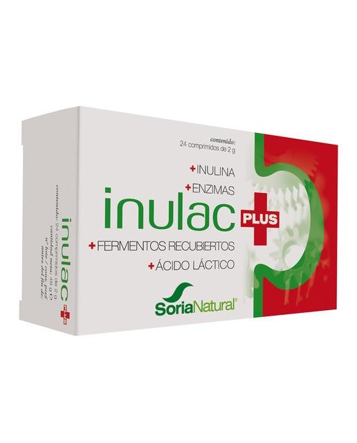 Inulac Plus Tablets es un complemento alimenticio diseñado para ser utilizado después de comidas pesadas. Su alto contenido de fibra contribuye a una mejor digestión. El formato incluye 24 comprimidos de 2 g cada uno. Los ingredientes de Inulac Plus Tablets son: Inulina (1060 mg), fructosa, aroma a piña, pancretina (80 mg), papaína (80 mg), amilasa (80 mg), corrector de acidez: ácido cítrico, estabilizante: almidón de arroz, antiaglomerante: sales magnésicas de ácidos grasos, ácido láctico (10 mg), sal, fermentos recubiertos (L. acidophilus, L. casei, L. plantarum, L. rhamnosus y L. bulgaricus en una cantidad aproximada de 5,05x107 UFC/comprimido).
