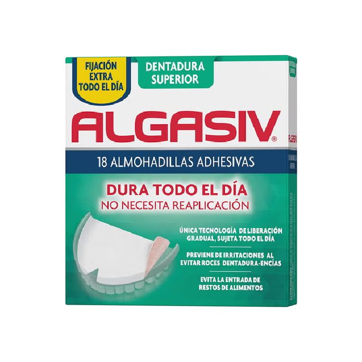 Las almohadillas Algasiv son ideales para fijar y adaptar la dentadura a las encías, mejorando el confort en la colocación y proporcionando una mayor comodidad de uso. Las Algasiv Almohadillas Superiores vienen en un paquete de 18 unidades y son finas almohadillas que aseguran una fijación perfecta de la dentadura postiza durante todo el día. Cubren por completo la superficie de la dentadura, eliminando la fricción con las encías y ayudando a prevenir la irritación. Su suave tejido se adapta perfectamente a la dentadura, llenando los espacios y actuando como una barrera que evita la entrada de molestos restos de alimentos. Gracias a su fácil uso, se pueden colocar en la dentadura sin dificultad y se retiran fácilmente sin dejar residuos.